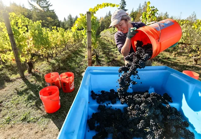 Pinot noir grapes are harvested at Bainbridge Vineyards